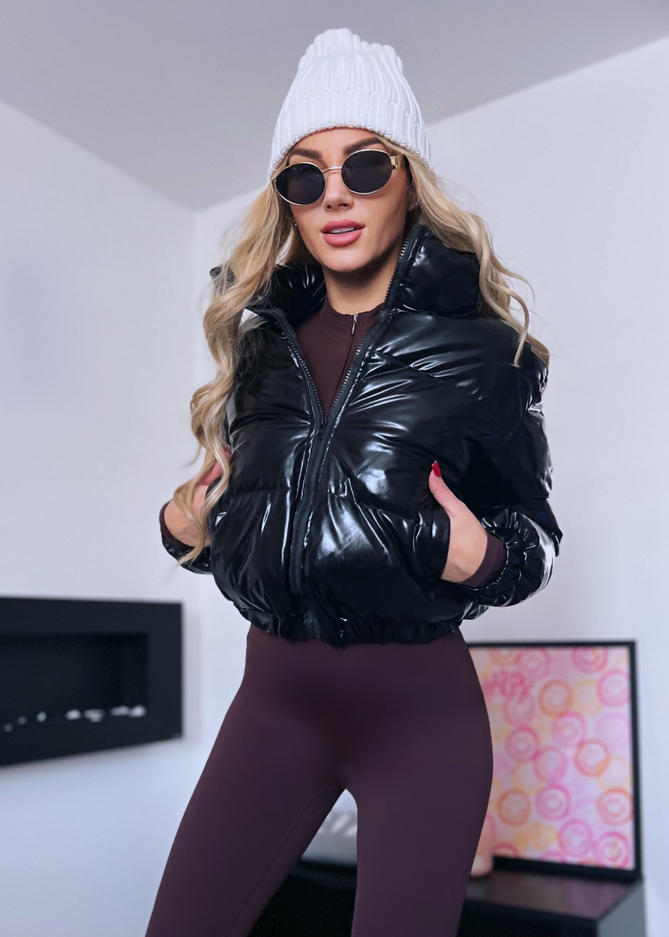Buď výrazná a zároveň v pohodlí s touto štýlovou čiernou puffer bundou. Lesklý povrch jej dodáva luxusný vzhľad, zatiaľ čo hrejivá výplň a vysoký golier ťa ochránia pred zimou. Praktické vrecká a elastické ukončenie rukávov i pásu zabezpečujú komfort počas nosenia.