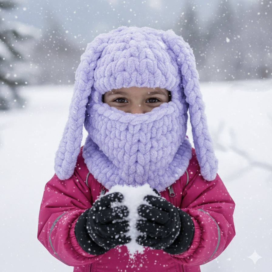 Roztomilé dlhé zajačie ušká dodávajú kukle hravý vzhľad, ktorý si deti okamžite zamilujú – ideálna na prechádzky, hry v snehu, sánkovačku či zimné fotenie.