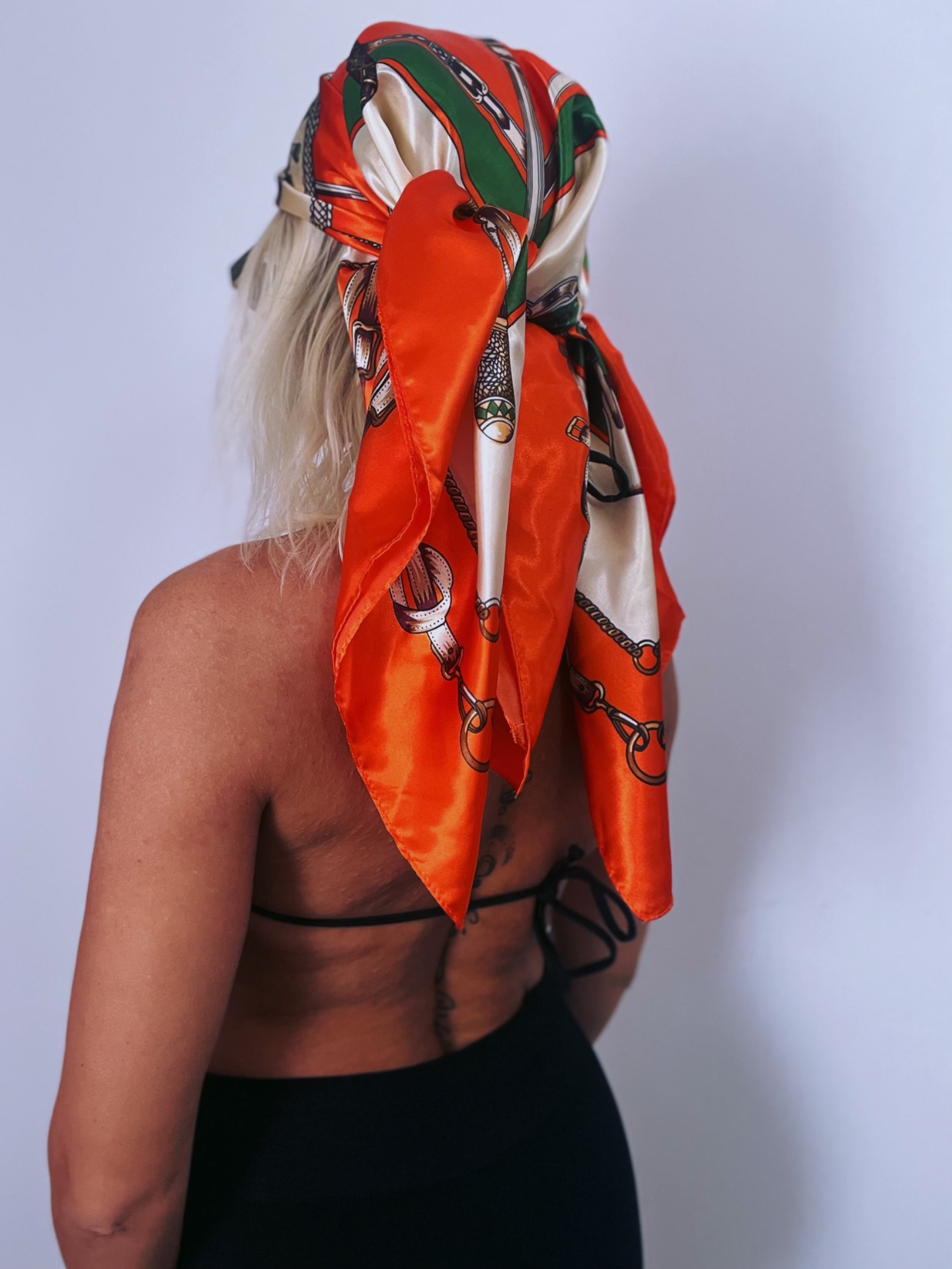 Luxusná saténová šatka v žiarivej kombinácii oranžovej, krémovej, zelenej a čiernej farby s elegantným vzorom reťazí a ornamentov. Je ľahká, jemná na dotyk a univerzálna – môžeš ju nosiť ako doplnok do vlasov, okolo krku, na kabelku alebo ako štýlový top či plážový turban.