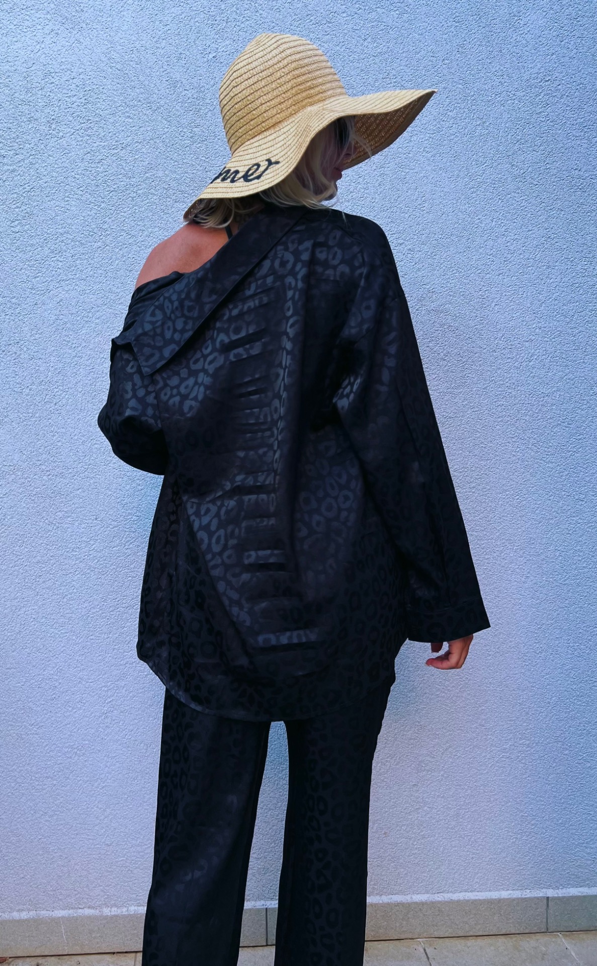 Luxusná čierna súprava "Midnight Wild" je stelesnením pohodlia a štýlu. Tento dvojdielny set obsahuje voľnejšiu košeľu s dlhým rukávom a nohavice s gumičkou v páse, ktoré sa dokonale prispôsobia postave. Jemný lesk a decentný leopardí vzor dodávajú modelu šmrnc a jedinečnosť.