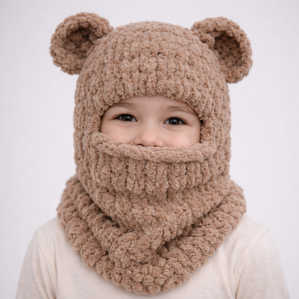 Kukla má praktický strih, ktorý chráni hlavu, uši, krk aj časť tváre pred chladom a vetrom. Roztomilé ušká dodávajú kukle hravý dizajn v štýle teddy medvedíka.