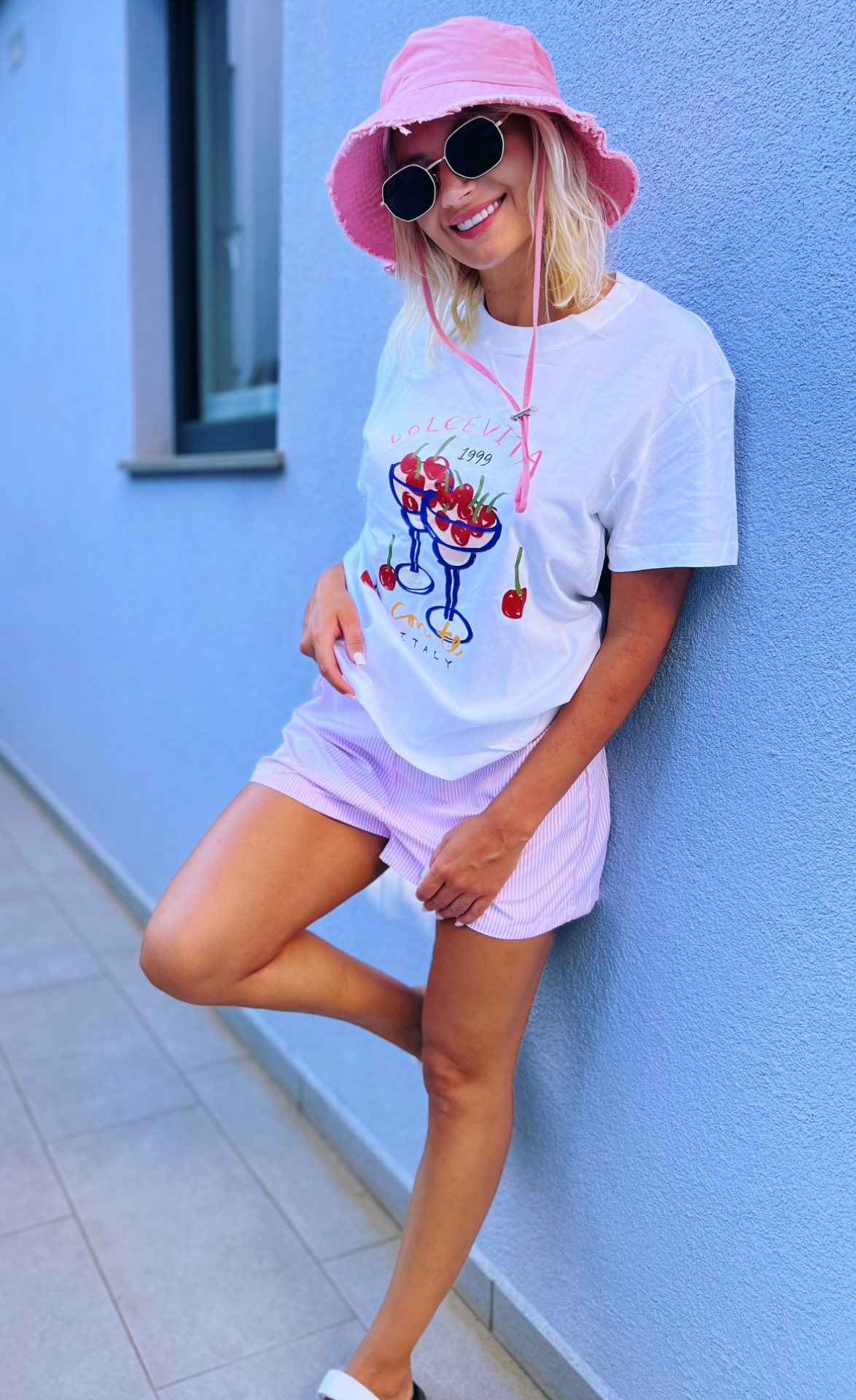 Oslávte letnú pohodu v tomto roztomilom a hravom tričku Dolce Vita Cherry, ktoré vás okamžite naladí na dovolenkovú vlnu! Biele tričko s veselou potlačou čerešní a farebným nápisom "Dolce Vita" je ideálne na voľné dni, výlety aj prechádzky po pláži. Príjemný bavlnený materiál zaručuje pohodlie počas celého dňa.